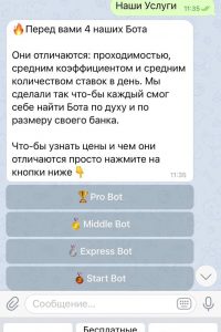 Start bot – включает в себя одну-две ставки в день с коэффициентом 1.75 и проходимостью в районе 73%. Стандартное предложение с абсолютно реалистичными цифрами. Добиться таких показателей может любая команда действительно опытных прогнозистов. Месяц подписки стоит 5000 рублей, три месяца – 10 000, а год – 20 000. Если месячный пакет прогнозов явно не является самым выгодным предложением на рынке, то абонемент на год уже выглядит гораздо вкуснее, конечно при условии, что проходимость прогнозов будет соответствовать заявленному показателю.Middle bot – улучшенная версия обычного абонемента. Проходимость прогнозов увеличена до 83%, при этом средний коэффициент на ставку также вырос до 1.83. Подобные показатели уже являются серьезной заявкой для любого каппера, так как далеко не каждый сервис сможет их выдавать на постоянной основе. По Middle подписке клиент получает от двух до трех прогнозов в день. Ее стоимость: 1 месяц – 8000 рублей, 3 месяца – 18 000, год – 40 000.Pro bot – премиальный вариант подписки, с помощью которой можно поднять ощутимые деньги даже на короткой дистанции. Коэффициент в 1.95 еще является вполне разумным, но вот проходимость в районе 90% больше похожа на сказку. Добиться таких показателей без использования инсайдерской информации о матче практически невозможно. Тем не менее, по заверениям самого каппера вся аналитическая работа проводится собственными силами рабочей группы. Так ли это, мы обязательно проверим на практике. Стоимость самой подписки: месяц — 15 000 рублей, 3 месяца – 30 000, год – 50 000. Количество прогнозов в день – от двух до трех.Express Bot – сервис также продает отдельную подписку на экспрессы. С первого взгляда проходимость в районе 78% при коэффициенте в 3.1 может показаться высокой, но вполне реалистичной, но так может подумать только тот человек, который не понимает, как работает экспресс. Подобные цифры получить сложно даже для людей с десятилетним стажем. Цена подписки на экспресс: месяц – 10 000 рублей, 3 месяца – 20 000, год – 40 000. Количество прогнозов в день – от двух до трех.
