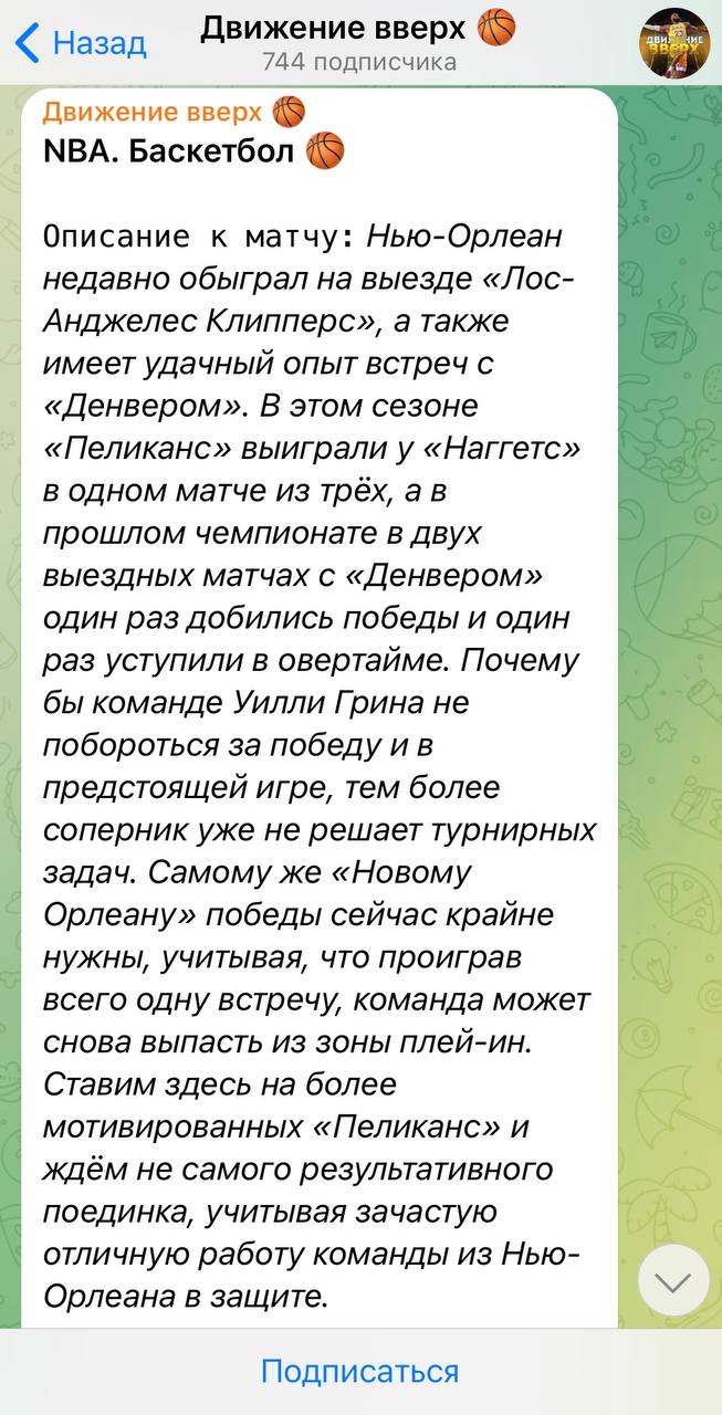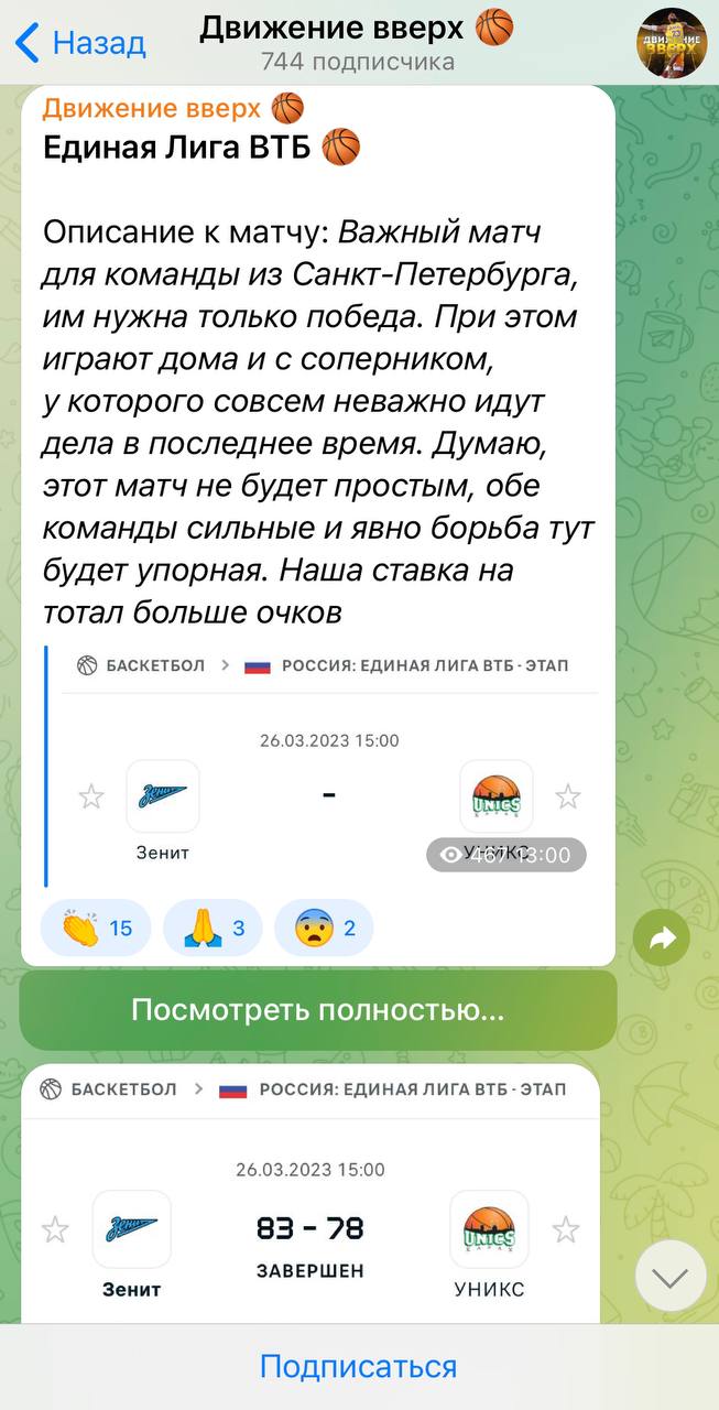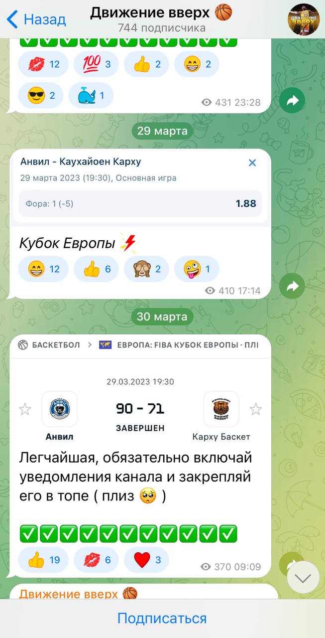Телеграмм-канал «Движение Вверх» полноценно работает с 10 марта 2023. На старте карьеры каппер ориентировался только на баскетбол.