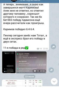 Стоимость подписки на вип-чат прогнозиста в постах Telegram не указывается, цену можно узнать только в личных сообщениях. Регулярно публикуется статистика закрытой группы. Проходимость обещают в 90%. Подряд якобы заходят 10-12 ставок.