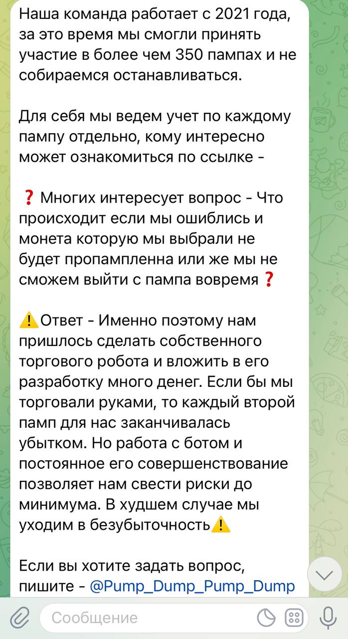 - Ознакомившись с этим разделом становится понятно как именно данная команда зарабатывает на пампах. Если вкратце, то они ежедневно отслеживают монеты которые потенциально могут быть пропампленны, затем выбирают один оптимальный вариант и с ним работают.