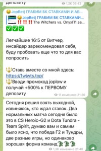 JopBet – Телеграмм канал, который посвящен киберспорту и хоккею. Автор проекта предпочитает ставки на матчи по Dota 2 и CS GO. Аудитория паблика – 2 тысячи подписчиков с высокой активностью.