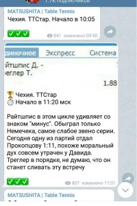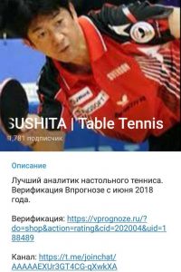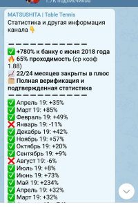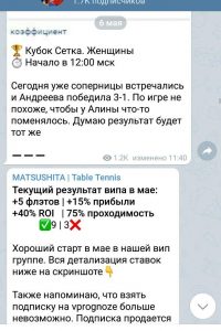 В telegram канале присутствуют серии из нескольких побед подряд со средними коэффициентами. В качестве исходов, в основном, выбираются победы, форы и тоталы в настольном теннисе по линии.
