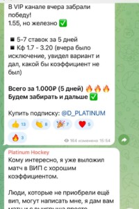 - Платных прогнозов в Телеграм «Платинум Хоккей» нет. Автор продает подписку в приватный чат. За неделю доступа нужно заплатить 1000 рублей. В сутки игроки получают 1-2 прогноза с коэффициентами от 1.70. Также можно рассчитывать на советы по распределению банка.