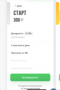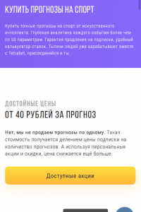 Система TetraBet помогает беттеру оптимально распределить игровой банк. Сумма пари будет зависеть от вероятности наступления события. Прогнозисты предлагают клиентам несколько видов подписки. Минимальный пакет «Старт» стоит 300 рублей в день. Участник получает 3 ставки.